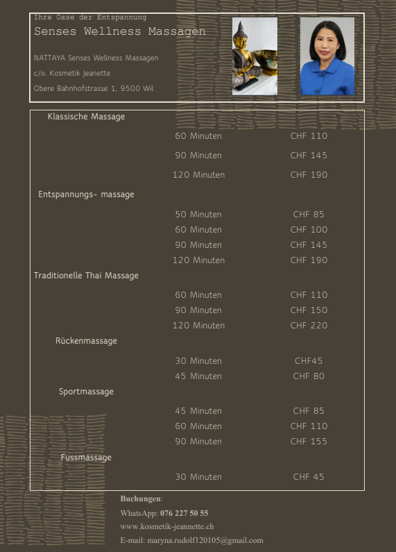 Unser Angebot überzeugt durch faire Preise und hervorragende Leistungen. Sie erhalten professionelle Behandlungen, die Ihre Erwartungen übertreffen und Ihr Wohlbefinden steigern.